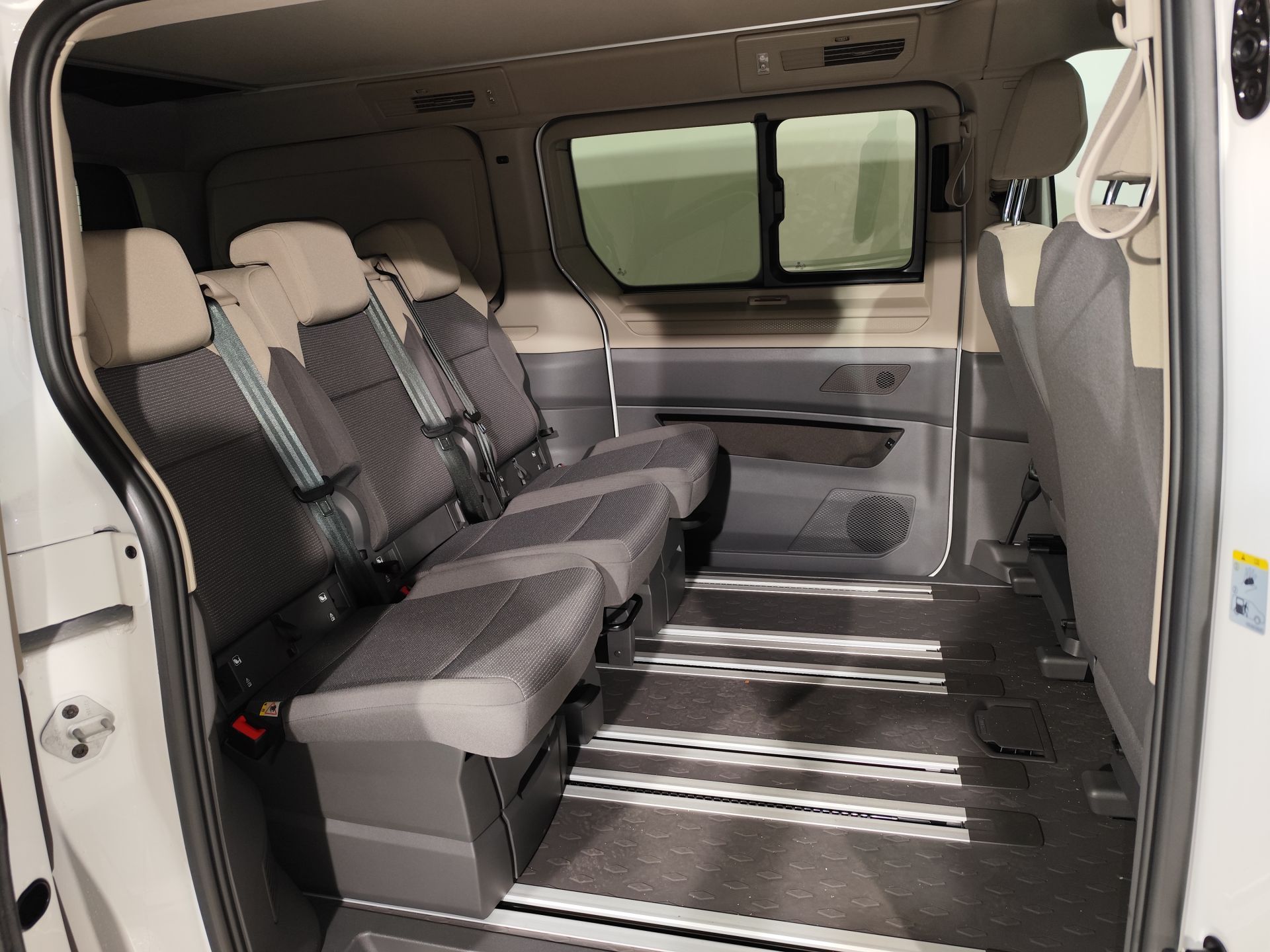- Asientos traseros de tres plazas de tipo individual desmontables de orientación delantera ajuste longitudinal manual con banqueta fija, respaldo abatible individual y ajuste manual del respaldo función cama